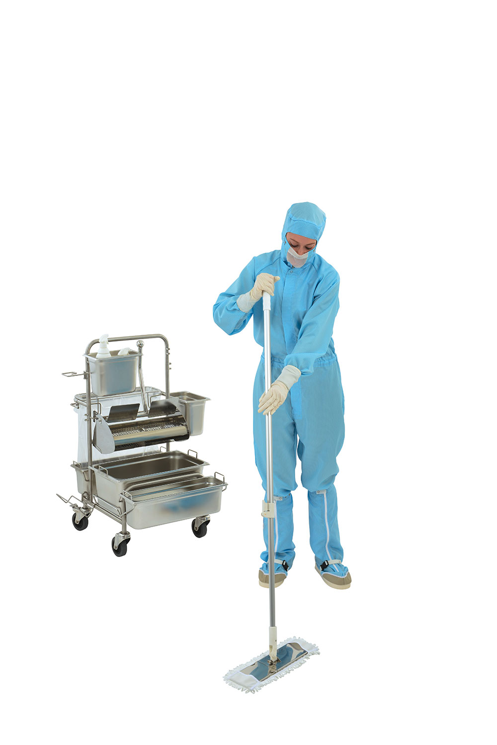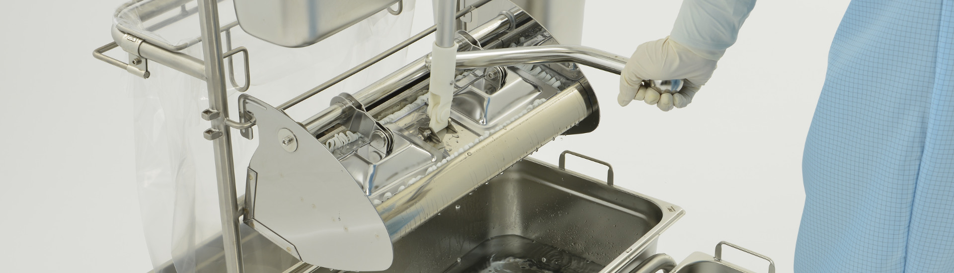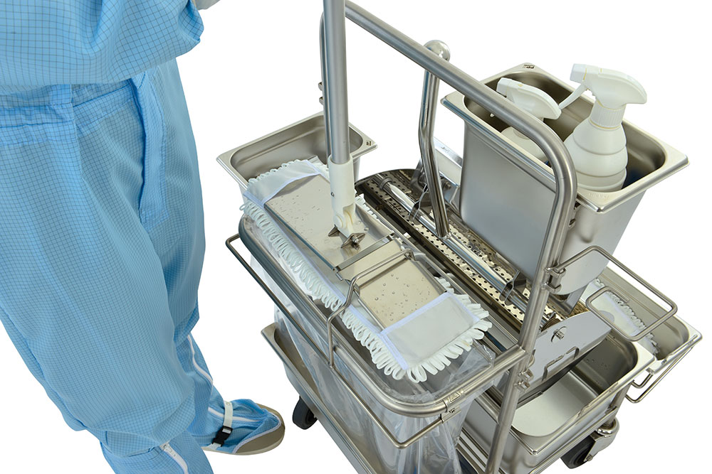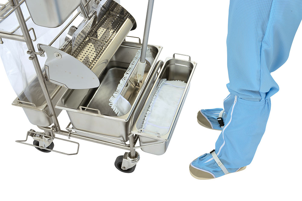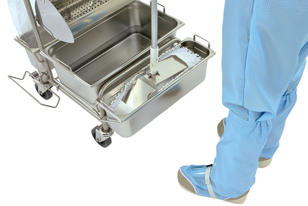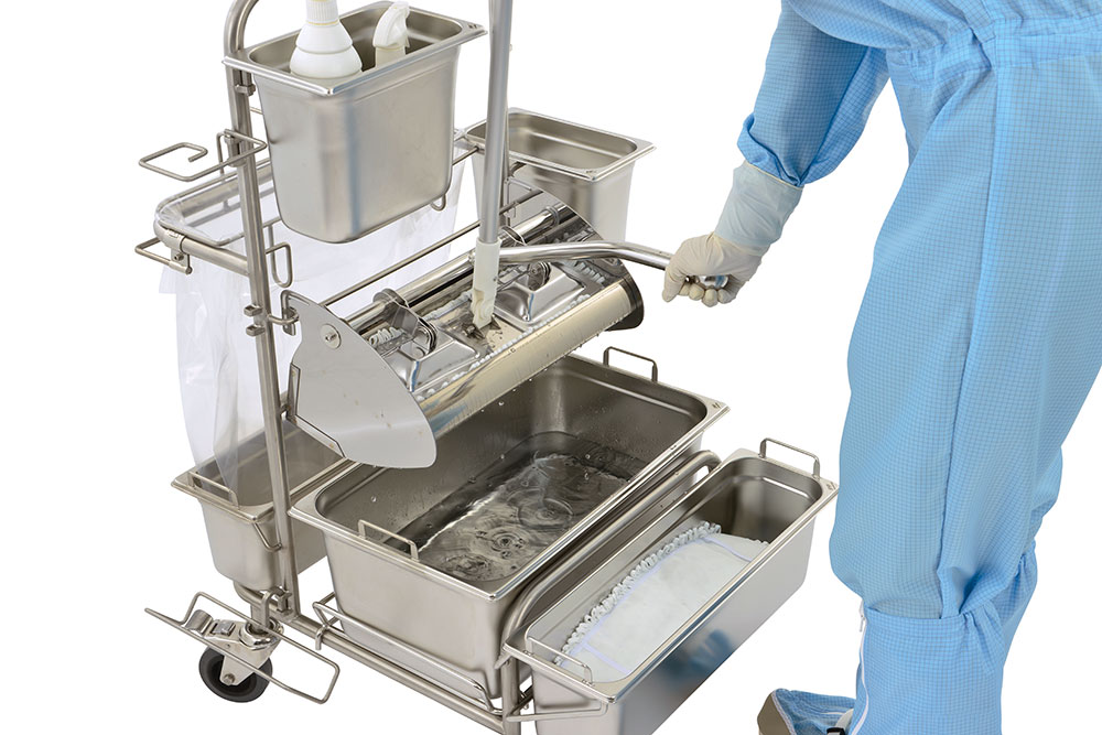 When cleaning in hygienically sensitive areasmthe avoidance of cross-contamination is a priority. Therefore, the mop cover must be changed after each wiping operation. Our Ringo GMP and Clino flat wringer systems are used to dose the moisture required for the respective area. Together with the MopJump an MopDrop system, touch-less and ergonomically optimized working is made possible.