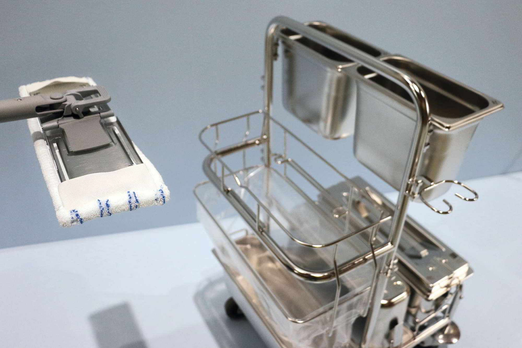 Die Positionierung des MopDrop CR unter dem Schiebebügel des Reinigungswagens stellt eine klare Trennung der Wagenbereiche in eine reine Seite (vor dem Schiebebügel) und eine unreine Seite (hinter dem Bügel), sicher.