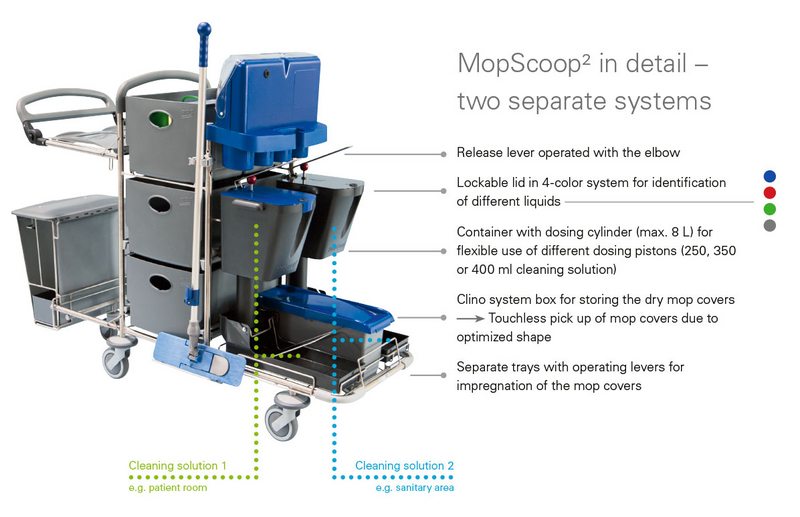 The innovative cleaning method MopScoop² for precise just-in-time impregnation of mop covers transfers the preparation directly to the cleaning trolley: