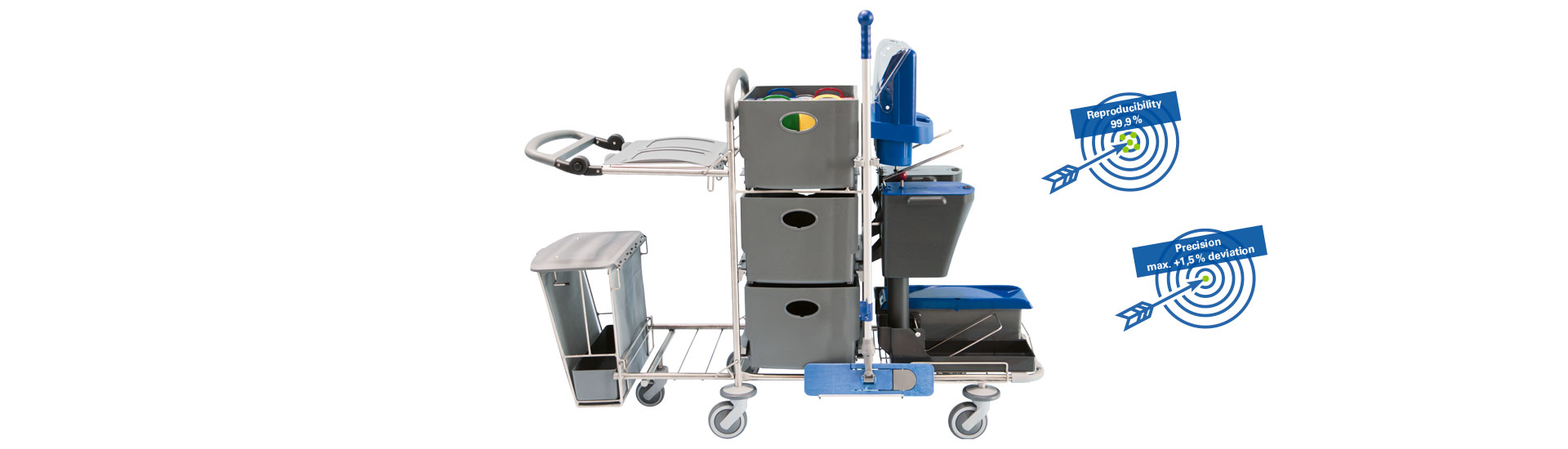 Thanks to two separate dosing units, the mop covers can be impregnated with a predefined amount of liquid (250, 350 or 400 ml) directly at the system trolley –