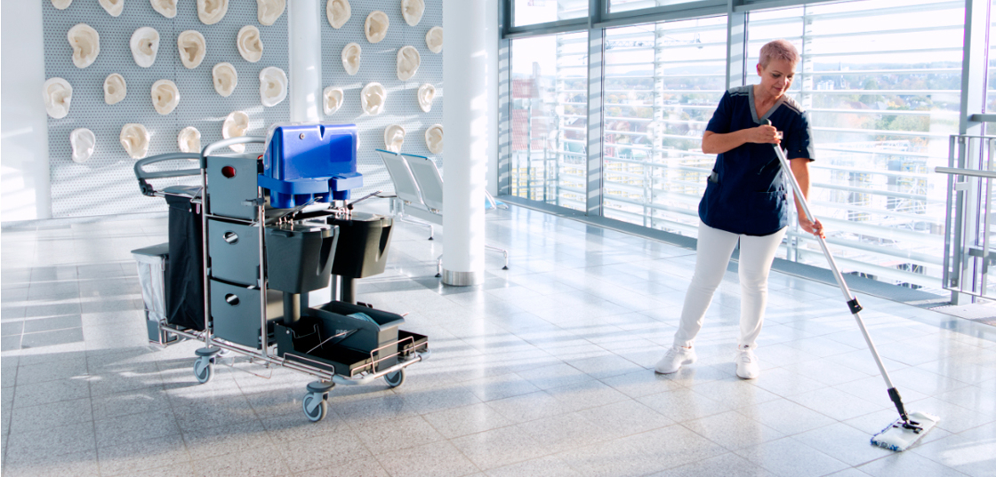 The Pfennig system is a holistic cleaning concept. It is not a question of a combination of individual components such as cleaning trolleys and textiles, but of a system solution precisely tailored to specific requirements. Based on the premises, the situation on site or the result to be achieved, the ideal method is selected along a cycle, the suitable components are selected and combined in one system. At Pfennig, we have developed our own system loops for cleaning in facility management and hospitals, as well as for clean room cleaning, in accordance with the so different requirements. Thanks to our modular construction system, all components fit into each other so that you can always meet your property requirements with flexible cleaning solutions.
