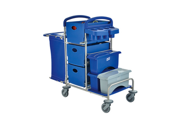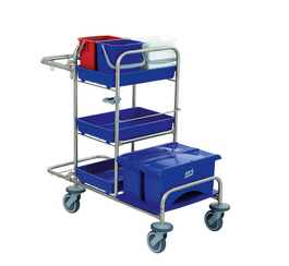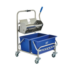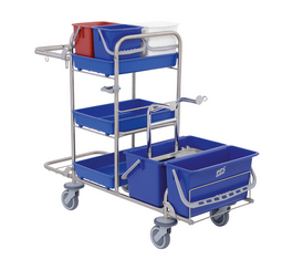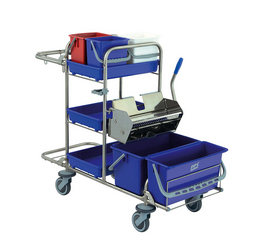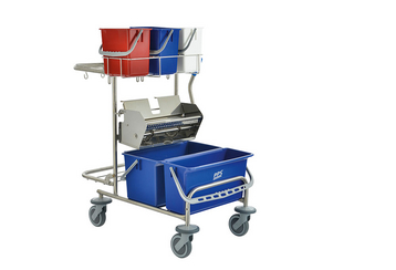 Der mittelgroße Reinigungswagen mit Edelstahl-Flachpresse und 3 Eimern für die Oberflächenreinigung.